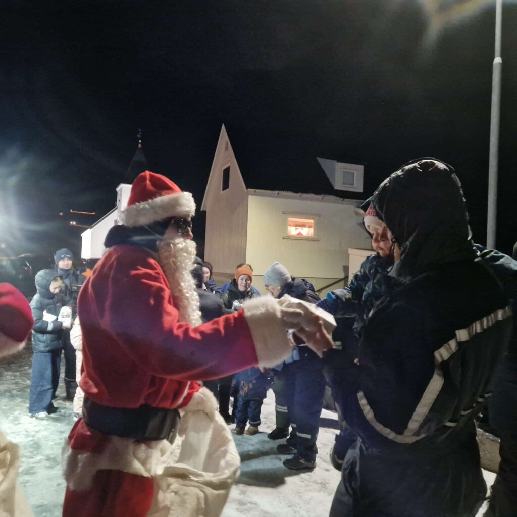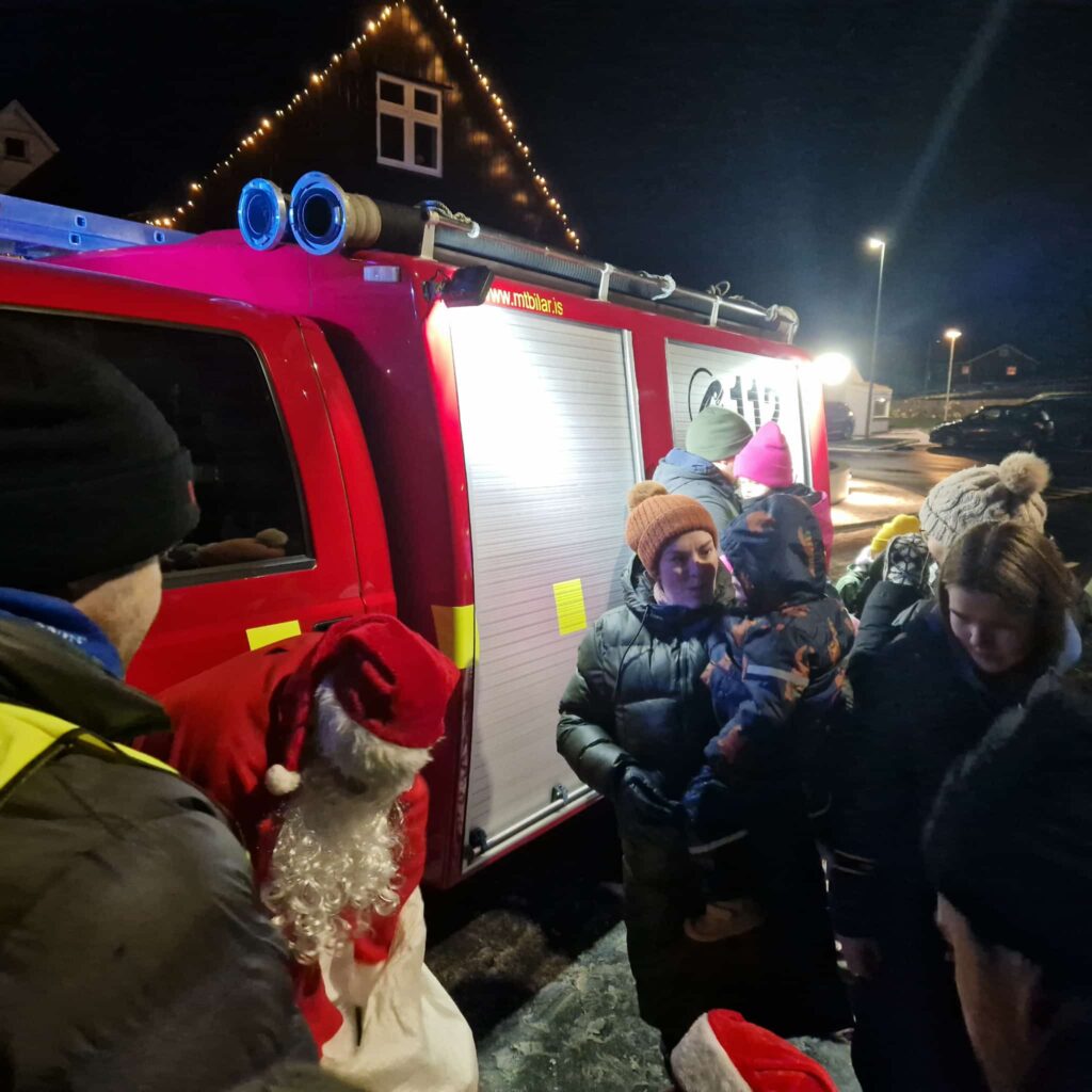 Løtu seinni kom róp í millum børnini, tá tey gjørdust varug við brannbilin, ið kom ýlandi oman ímóti bygdini. Jólamenn góvu børnunum pakkar við góðgæti og eftir hetta bjóðaði kommunan til kakao og bollar, ið ivaleyst kom væl við í heldur kalda veðrinum.
