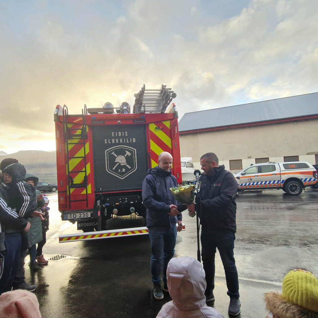 Eftir røðuna handaði borgarstjórin lykilin til Asbjørn Østerø, formann sløkkiliðsins. Asbjørn Østerø segði eisini nøkur orð, har hann takkaði fyri nýggja bilin, og vísti á at gamli bilurin nú er 24 ára gamal. Talan er um fyrsta brannbilin á Eiði, ið var stórt framstig tá, men nú hevur tann bilurin so tænt fyri seg. Hann rósti brannmonnunum og helt fyri, at teir kanska høvdu hug at goyma seg burtur til slík hátíðarhald, men tá ið á stendur, kann ein líta á teir. Umframt handan av bilinum, varð eisini nýtt búmerki fyri sløkkiliðið kunngjørt.