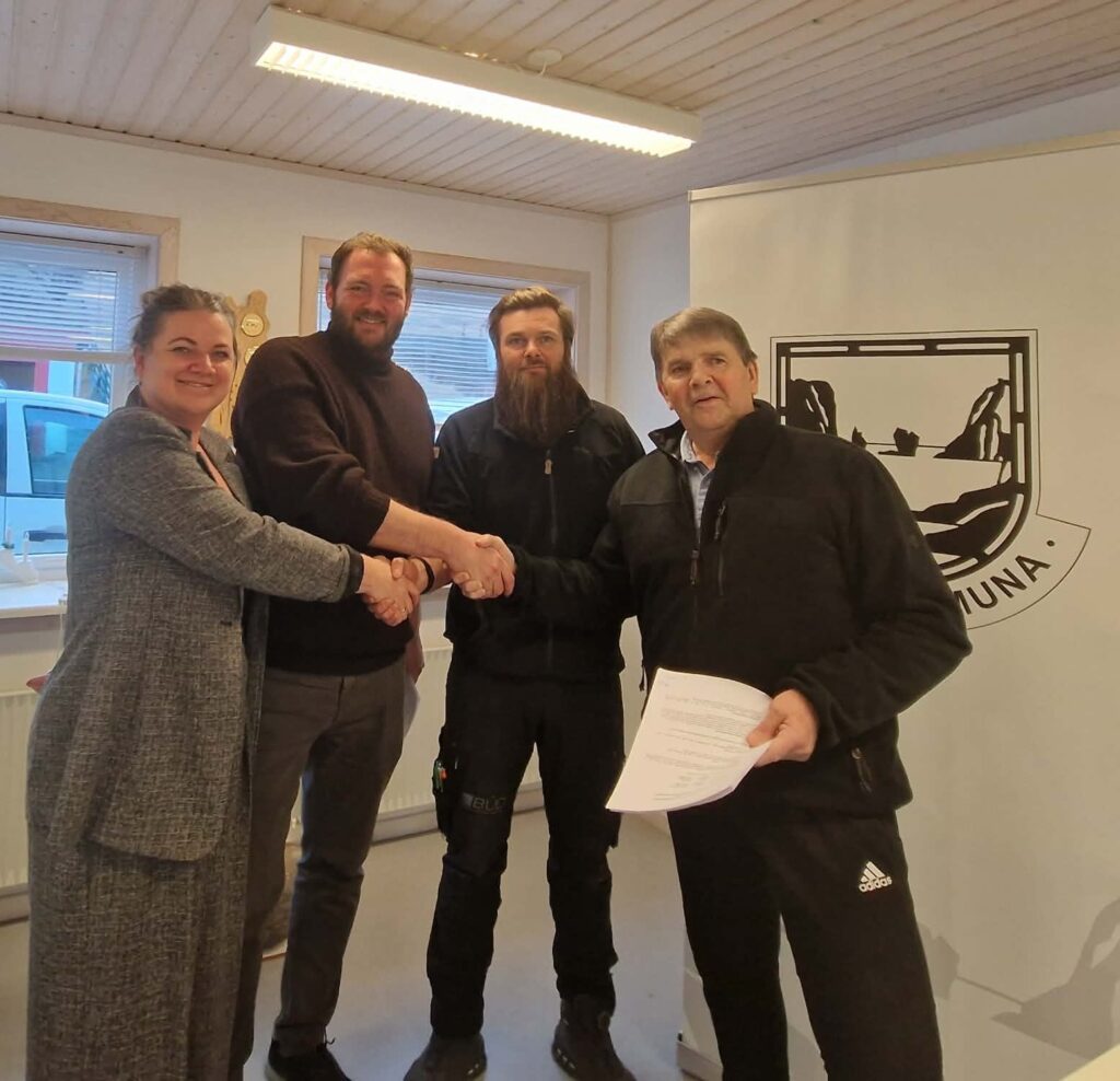 Á myndini síggjast Anfinnur Kruse og Tonny Kruse fyri Sp/f Búð saman við Jógvani í Skorini og Tove Kruse Samuelsen fyri Eiðis kommunu.